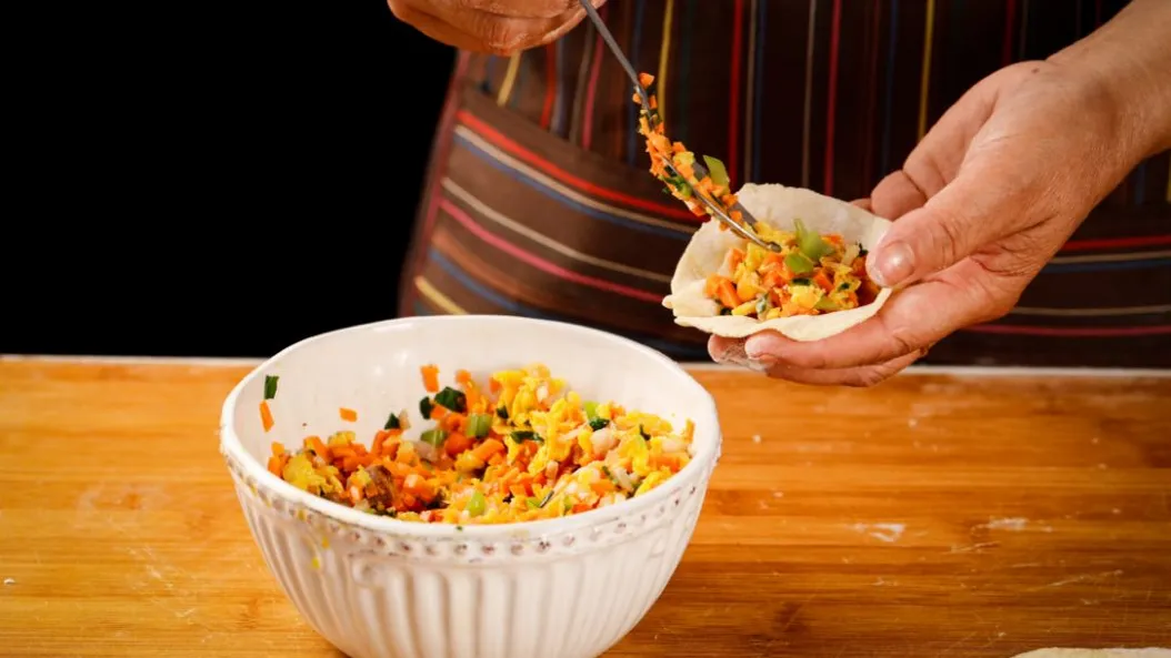 - Vegansk og moderne: fylt med tofu, søtpotet, kimchi og vårløk – kremete, mildt spicy og frisk.