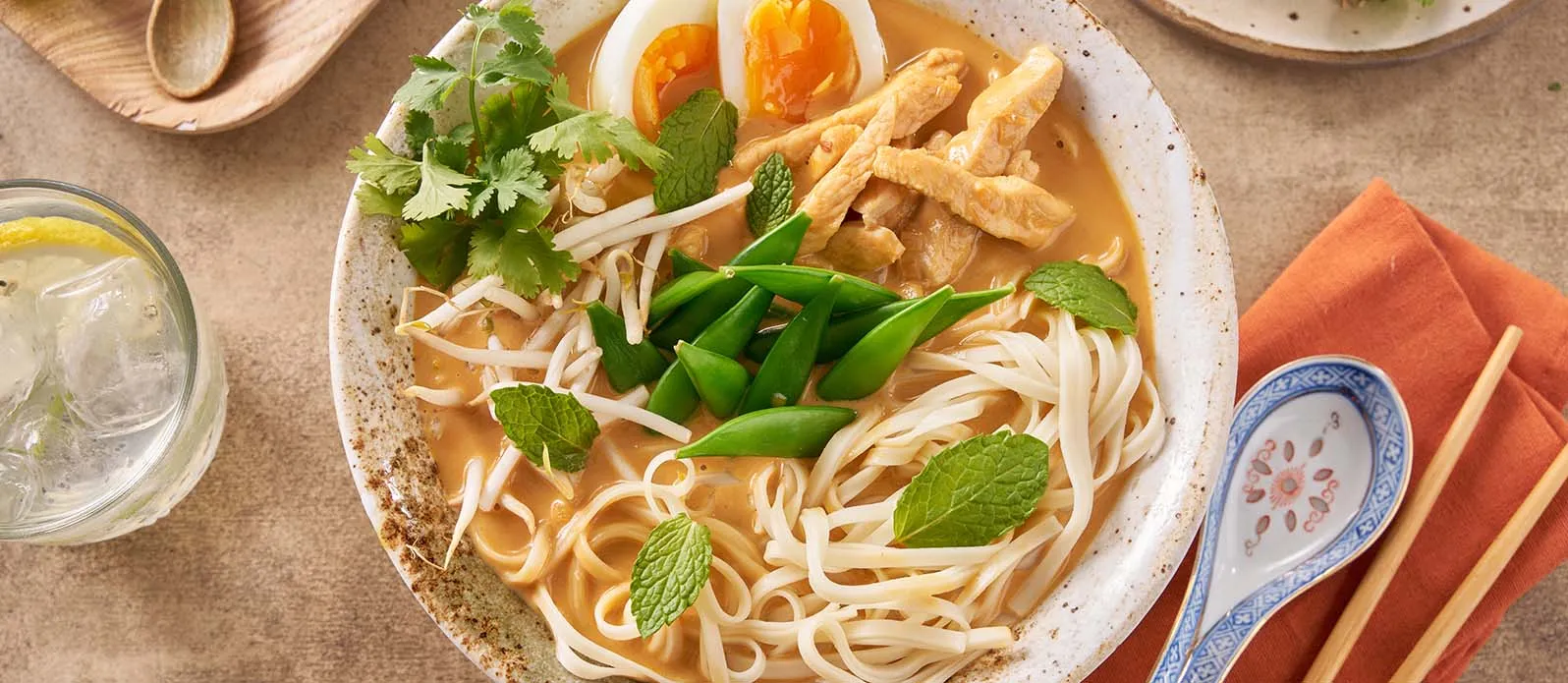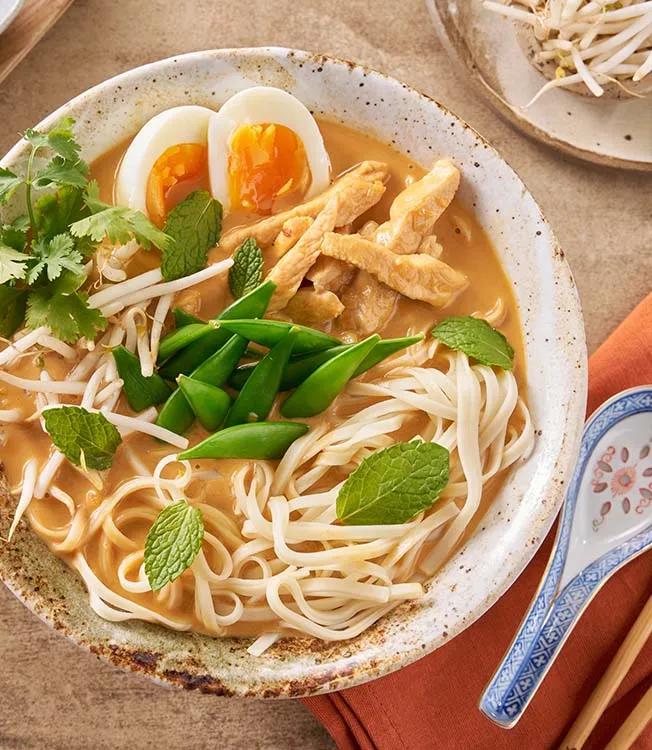 Aromatisk curry mee med mør kylling, sprø grønnsaker og eggenudler i en fyldig kraft med kokos og teriyaki – en mettende og fargerik bolle med varmende smaksglede, klar på 35 minutter.