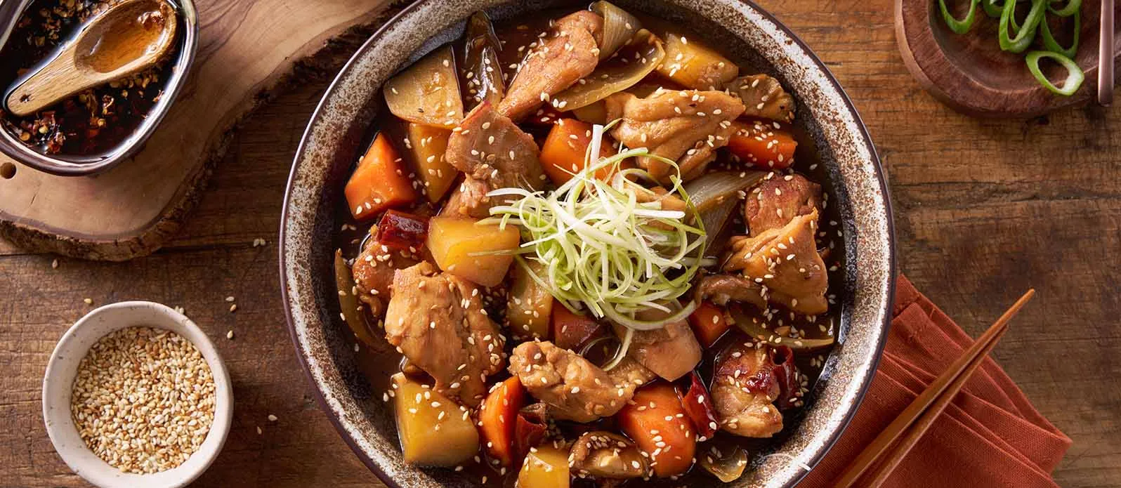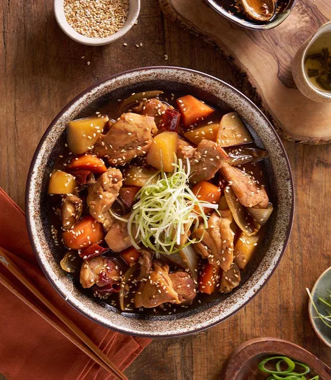 Møre kyllinglår bresert med grønnsaker i Kikkoman Soyasaus og avrundet med Kikkoman Sesamolje. En tykk, glansfull saus og en sprø topping av sesamfrø og vårløk gir retten en karakteristisk smak av Korea.