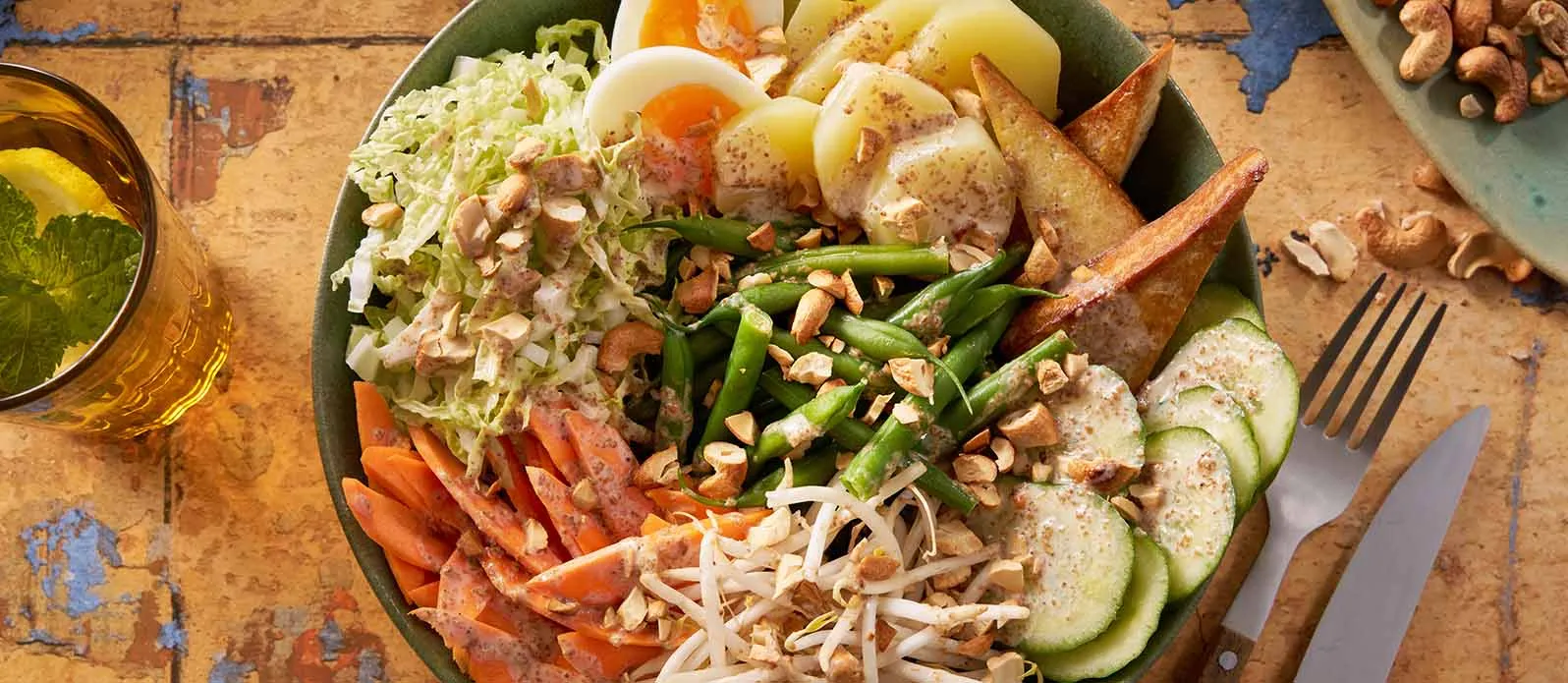 Gado-gado-salat fra Indonesia, toppet med aromatisk Kikkoman Sesamsaus. Nøtter gir sprø tekstur og setter sitt eget preg på retten.