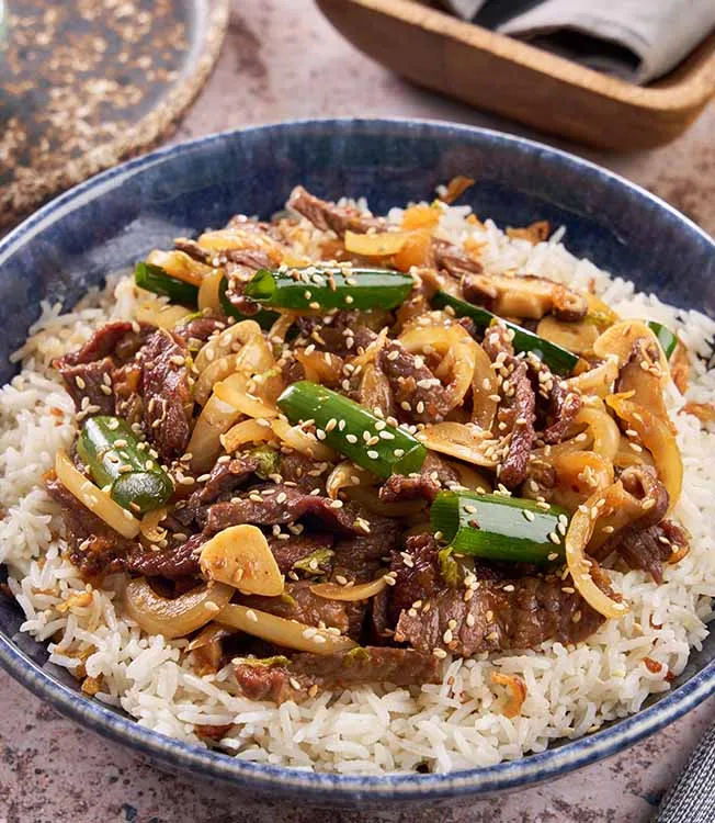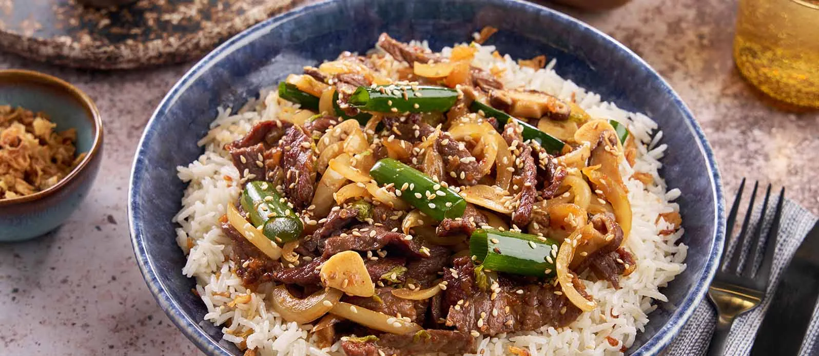 Mør biff wokket med shiitakesopp og kimchi i Kikkoman Glutenfri Soyasaus. Med saftig kjøtt og en dyp smak av umami som berikes av ristet sesam og vårløk, blir dette en rik og mettende rett.