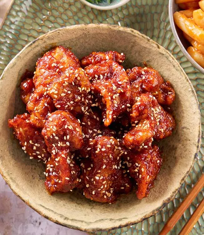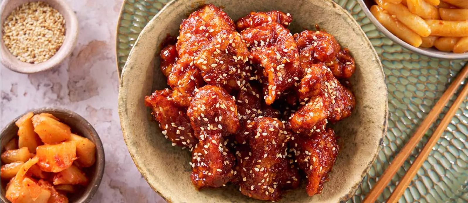Saftig kylling, dobbeltfritert for ekte sprøhet og overtrukket med søt-spicy Kikkoman Kimchi Chili Sauce med honning og hvitløk – autentisk koreansk street food på sitt beste.