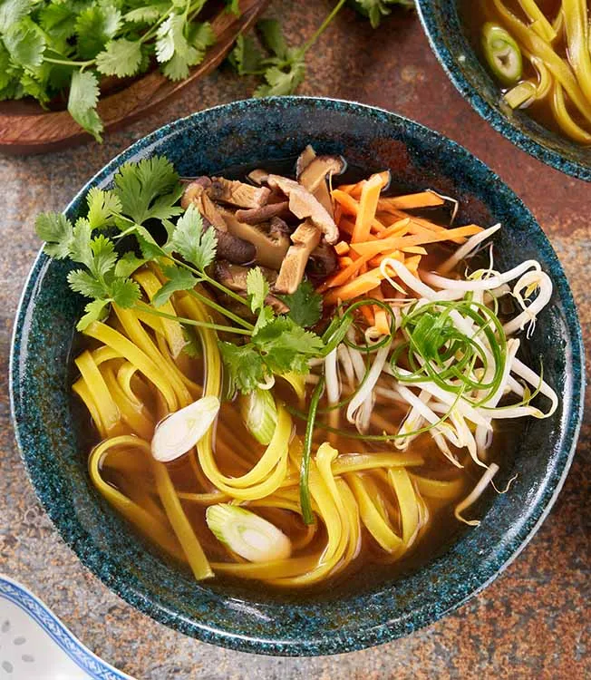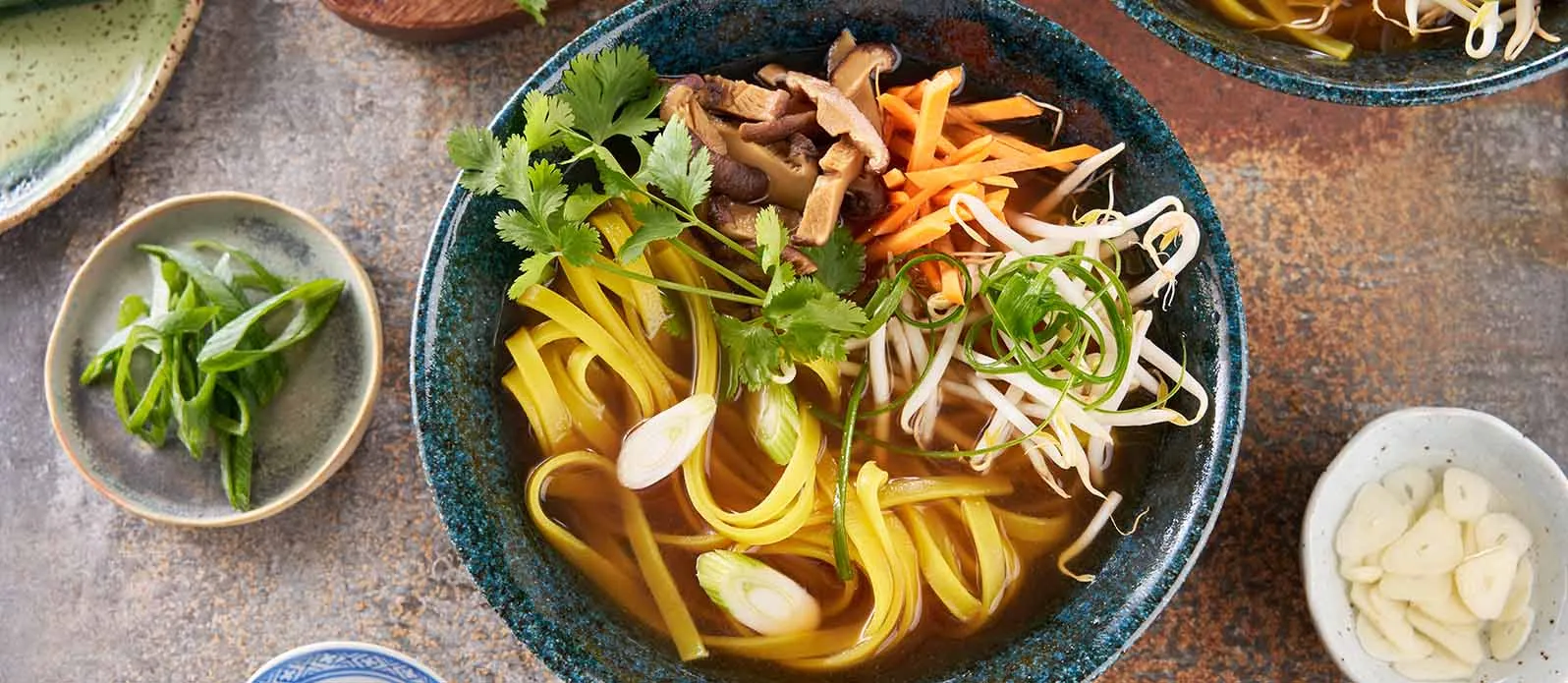 Aromatisk vegetarisk pho med tofu, shiitakesopp og friske grønnsaker i en kraft som dufter av stjerneanis, kardemomme og ingefær. Lett, sunn og full av umami med Kikkoman Glutenfri Soyasaus.