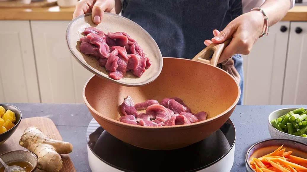 Wokk andekjøttet i oppvarmet olje i 2–3 minutter til det er lett brunet. Ta det deretter ut av wokpannen og legg til side.