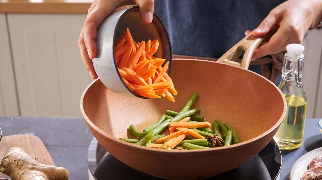 Varm opp oljen i den samme wokpannen, tilsett ingefær, gulrot, brekkbønner og stjerneanis, og wokk i 2–3 minutter. Tilsett vann, og reduser væsken i ca. 2 minutter til bønnene mykner.