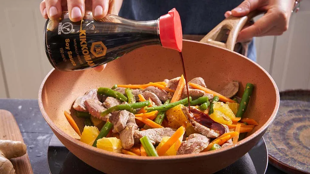 En velduftende wokrett der mørt andekjøtt møter syrlig appelsin, frisk ingefær og Kikkoman Soyasaus – en perfekt balanse mellom søt, salt og aromatisk smak i hver bit.