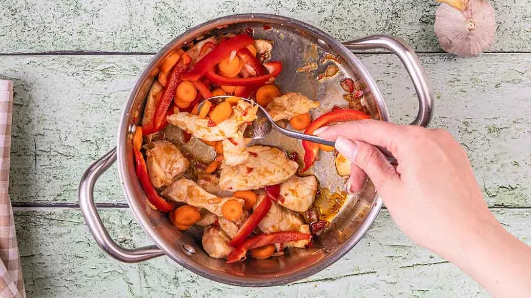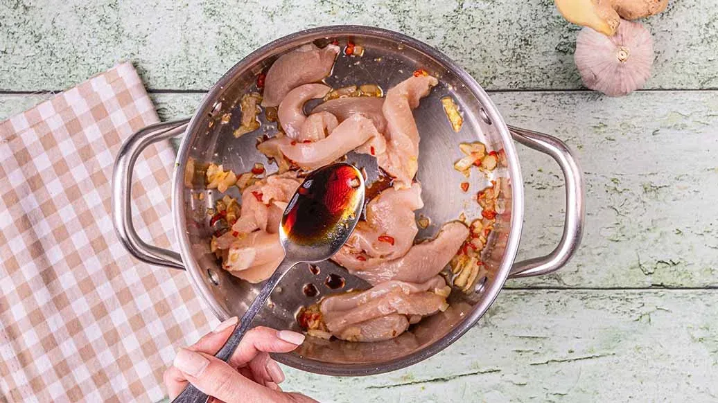 Hakk løken. Sauter hakket løk, chili, hvitløk og ingefær i vegetabilsk olje. Tilsett oppskåret kyllingfilet og Kikkoman Soyasaus. Stek i 2 minutter under konstant omrøring.