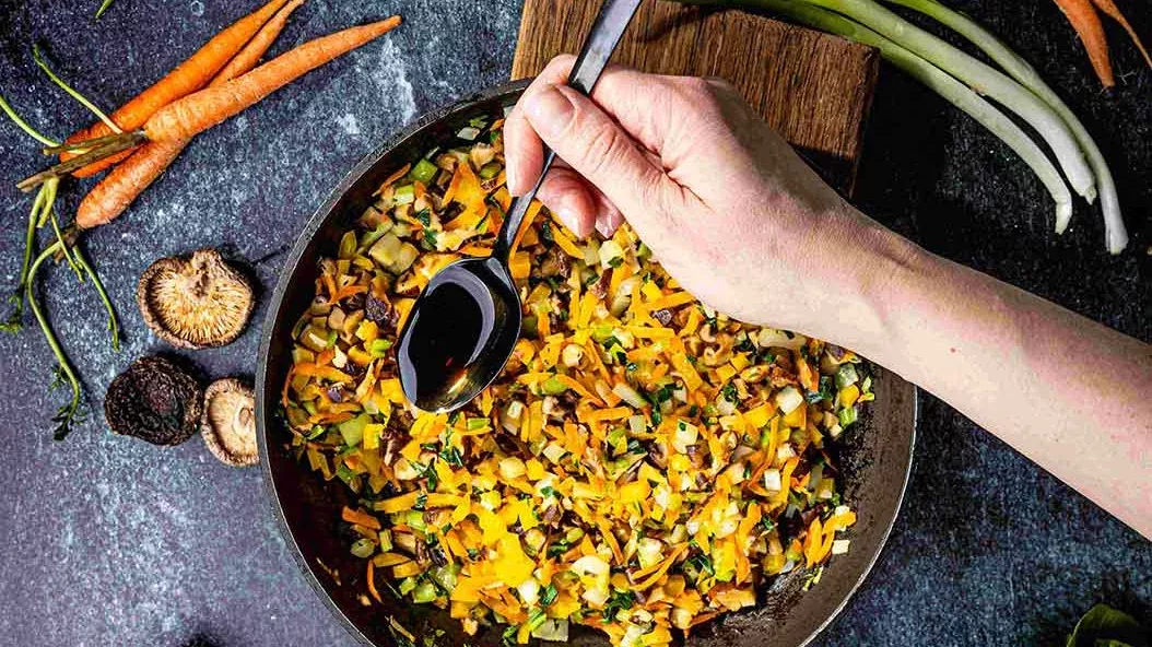 Bløtlegg soppen i varmt vann og la stå i 15 minutter. Hakk pak choi. Riv gulroten på et grovt rivjern og finhakk paprika og hvitløk. Sauter grønnsakene i Kikkoman Sesamolje, tilsett deretter hakket sopp og Kikkoman Soyasaus. Stek i noen minutter under konstant omrøring til grønnsakene er myke. La stå til avkjøling.