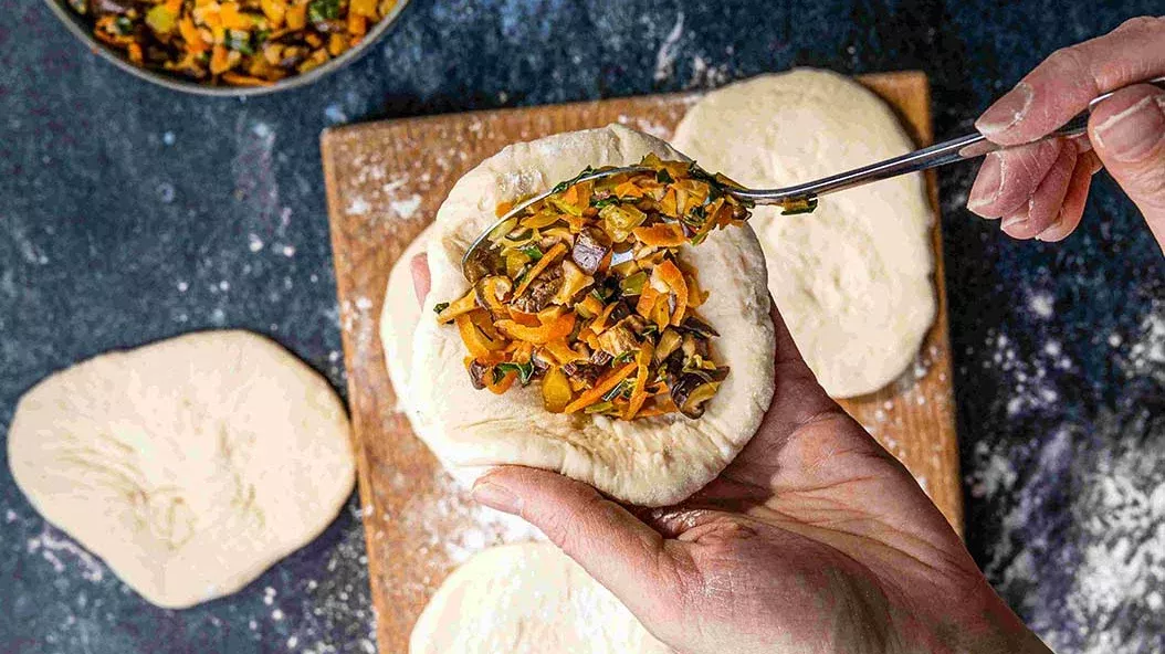 Del deigen fra steg 1 i 6 like store porsjoner, og form hver porsjon til en bolle. Kjevl den ut til en rund skive. Legg fyllet fra steg 2 på hver skive og klem sammen sidene til du får en fylt bolle.