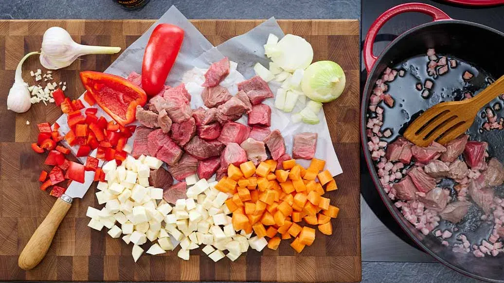 Varm opp oljen i en gryte eller tykkbunnet panne og brun hjortekjøttet og baconet i 8–10 min. Skjær paprika, gulrøtter, pastinakker og løk i terninger, finhakk hvitløken, og ha alt oppi gryten. Stek i ca. 8 minutter. Rør om iblant.