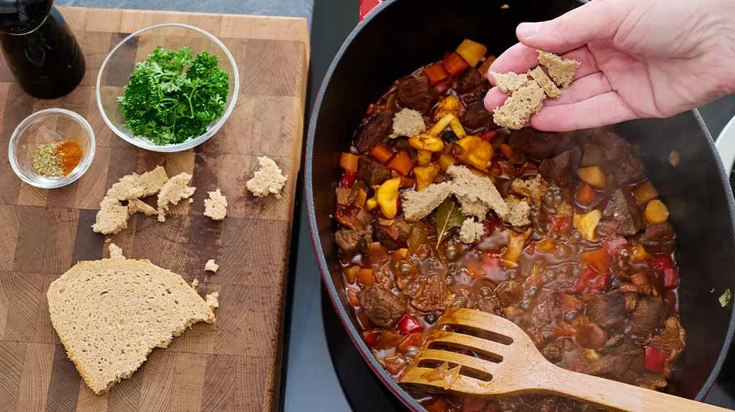Skjær bort brødskorpen og riv brødet i små biter. Bruk dem til å jevne gulasjen, og krydre med pepper, chilipulver og merian. Vask og tørk persillen, plukk så av bladene. Skjær opp dumplingrullen, anrett på tallerkener sammen med gulasjen, garner med persille og server.