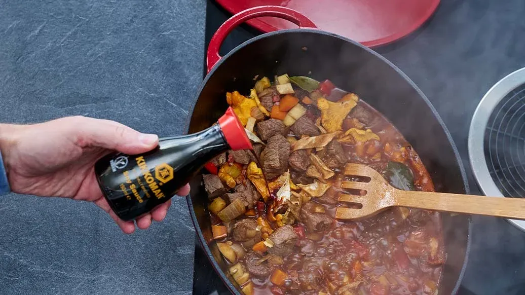 En festlig gryte med sopp, rotgrønnsaker og tørket frukt, avrundet med rødvin og Kikkoman Soyasaus. Servert med dumplings blir denne fyldige, søtsalte gulasjen til et perfekt vintermåltid.