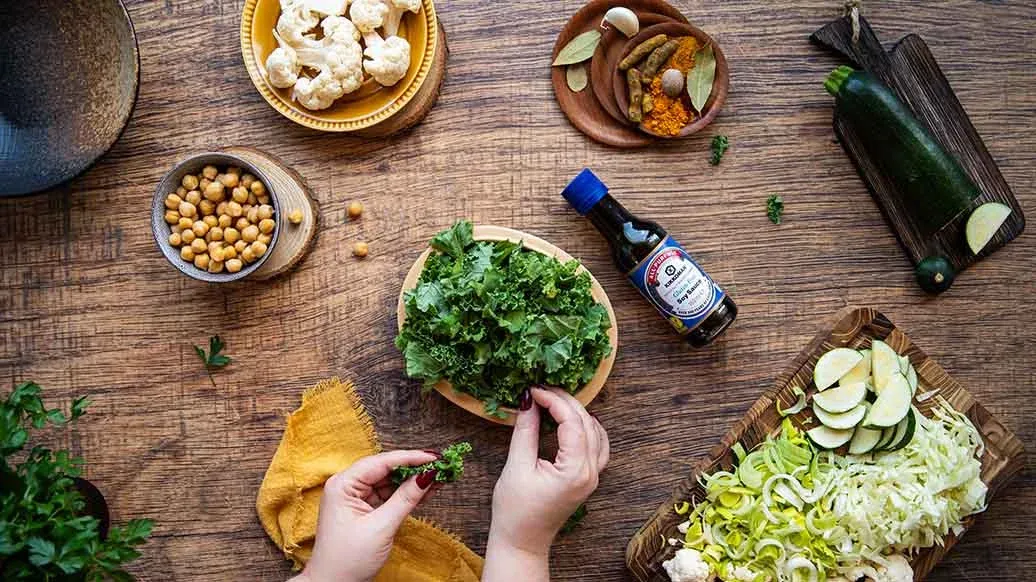 Stek grønnsakene fra steg 1 i en gryte med oljen, tilsett så hvitløk, timian, kryddere og laurbærblader. Hell i kraften og Kikkoman Glutenfri Soyasaus og kok i 8 minutter til grønnsakene har myknet litt.