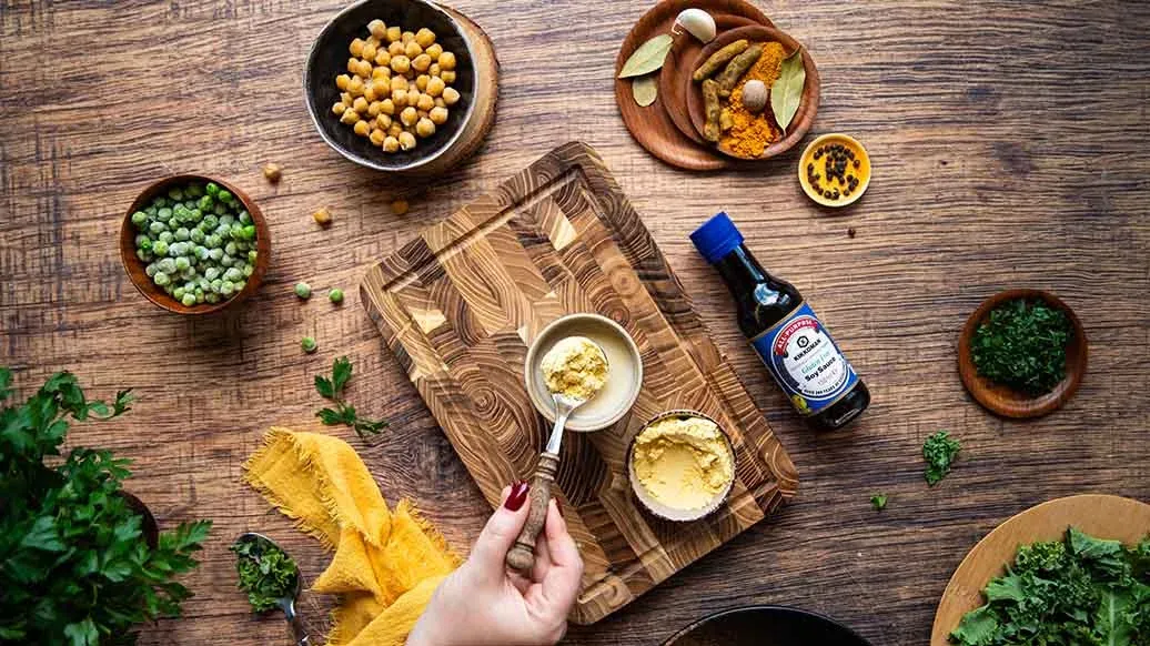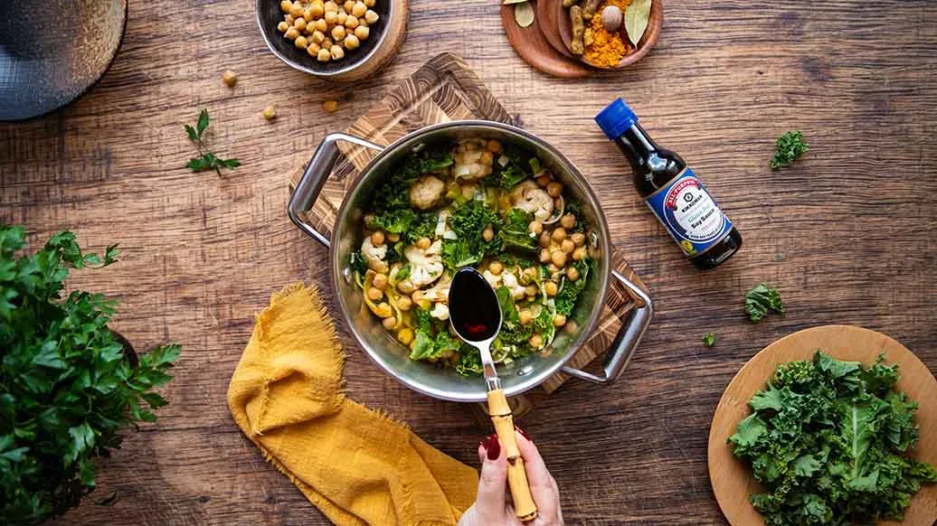 2 ss rapsolje – 2 hvitløksfedd, hakket – 2 kvister fersk timian – ½ ts gurkemeie – 0,33 ts karri – 2 klype chilipulver – 1 klype muskatnøtt – 2 laurbærblader – 7 dl grønnsakskraft – 700 dl vegetable stock – 3 ss Kikkoman Naturlig Brygget Tamari Glutenfri Soyasaus