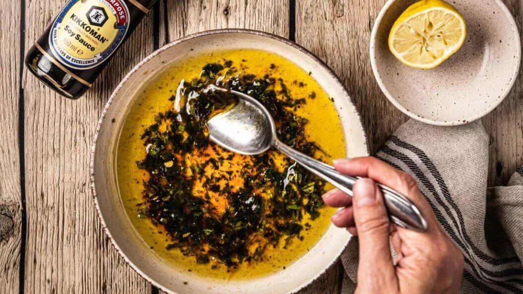 5 ss olivenolje – ½ sitron (saft) – 1 ss Kikkoman Naturlig Brygget Soyasaus – ½ ts pepper – 1 ss honning – 80 g hakket mynte