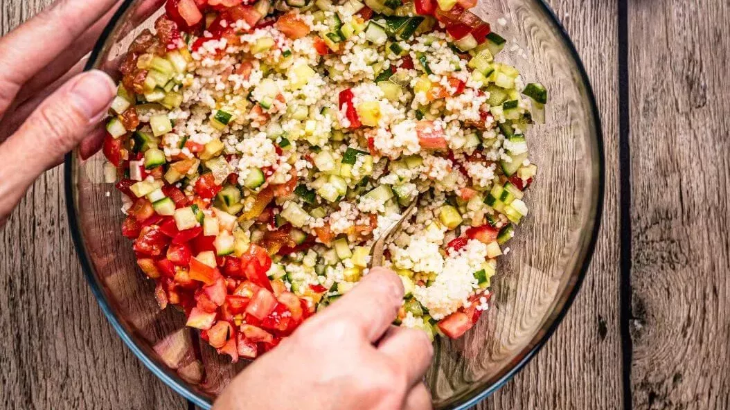 Ha couscousen oppi en stor bolle og dekk den med kokende vann, cirka 1 cm over couscousen. Dekk bollen og la den stå i 5 minutter. Skjær agurken og tomaten i terninger, ha dem så oppi couscousen. Bland godt.