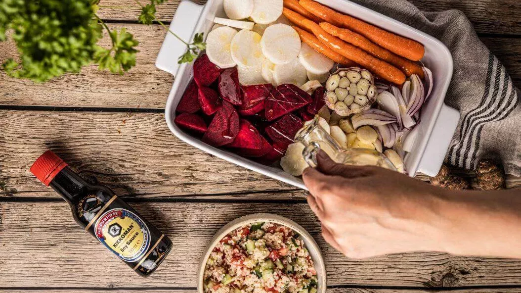 Vanligvis marineres maten før den bakes i ovn, men i denne oppskriften brukes marinaden etterpå. Marinaden blir absorbert av de stekte grønnsakene, noe som gir dem en mer uttalt smak.