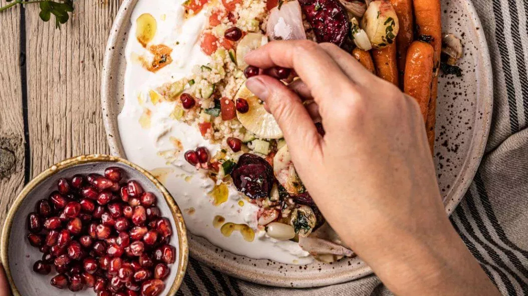 Dette deilige og næringsrike måltidet med grønnsaker og couscous er en fantastisk hovedrett. Flere typer rotfrukter stekes og marineres deretter i en spenstig sitronmyntedressing, før de serveres med kremet burrata. En eksplosjon av smaker og aromaer.