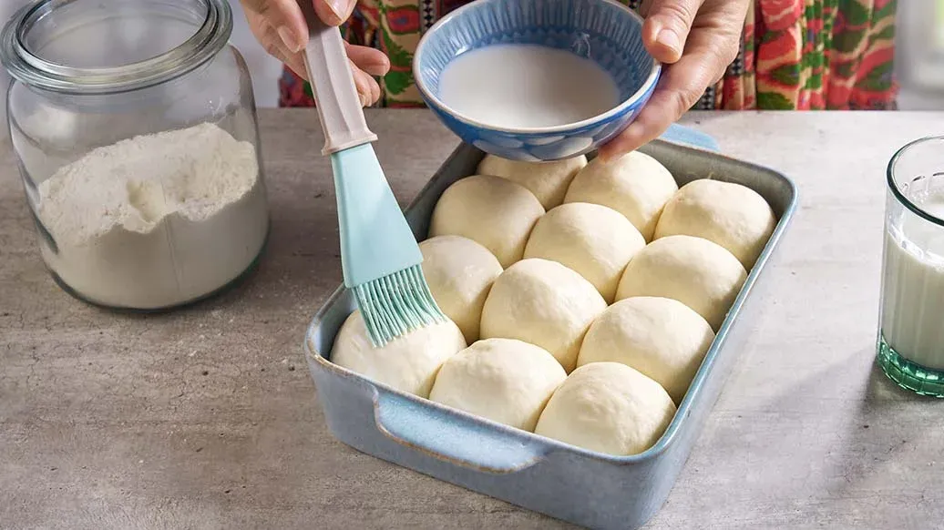 Varm opp 120 ml av melken til 38 °C og bland med sukker og gjær. Tilsett gradvis 170 g mel og rør om til en deig. Smelt 5 g smør og ha oppi deigen, og kna den i ca. 10 minutter. Del deigen i 12 boller og legg dem på et innsmurt stekebrett penslet med 10 g smeltet smør. Dekk bollene og la dem heve seg i 40 minutter. Pensle deretter toppene grundig med 20 ml melk og stek i ovnen ved 180 °C i 20 minutter til toppene er gyllenbrune. Server dhalen med pavbollene, og garner med oppskåret chili.