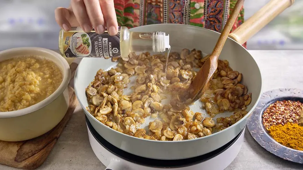 Kok linsene i grønnsakskraften i 10 minutter. Karamelliser løk og sopp i klaret smør i 10 minutter til de er gylne, tilsett deretter Kikkoman Mirin-Style Søt Smakssetter og sauter i 1 minutt. Tilsett spisskummen, gurkemeie og chiliflak og stek i 10 sekunder så aromaene slippes. Rør inn linsene og kok i 5 minutter.