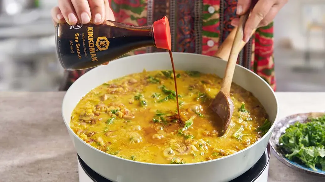 Ha grønnkålen oppi pannen med linser og grønnsaker, og kok i 2–3 minutter. Krydre med Kikkoman Soyasaus.