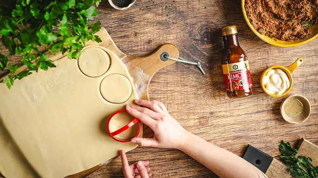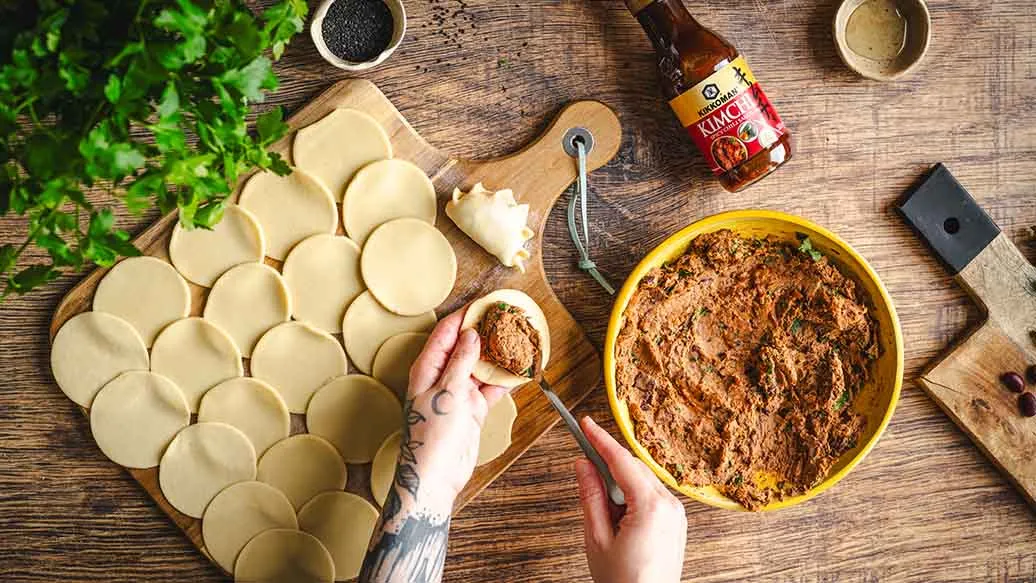 I fyllet kan du erstatte Kikkoman Kimchi Chilisaus med 1 ss srirachasaus blandet med 1 ss Kikkoman Soyasaus. Deigen kan også erstattes med ferdiglaget butterdeig.