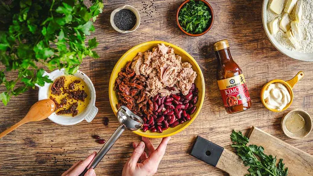 Sil av tunfisken og kjør den sammen med bønner og soltørkede tomater til en litt grov mos. Rør inn persille og Kikkoman Kimchi Chilisaus.