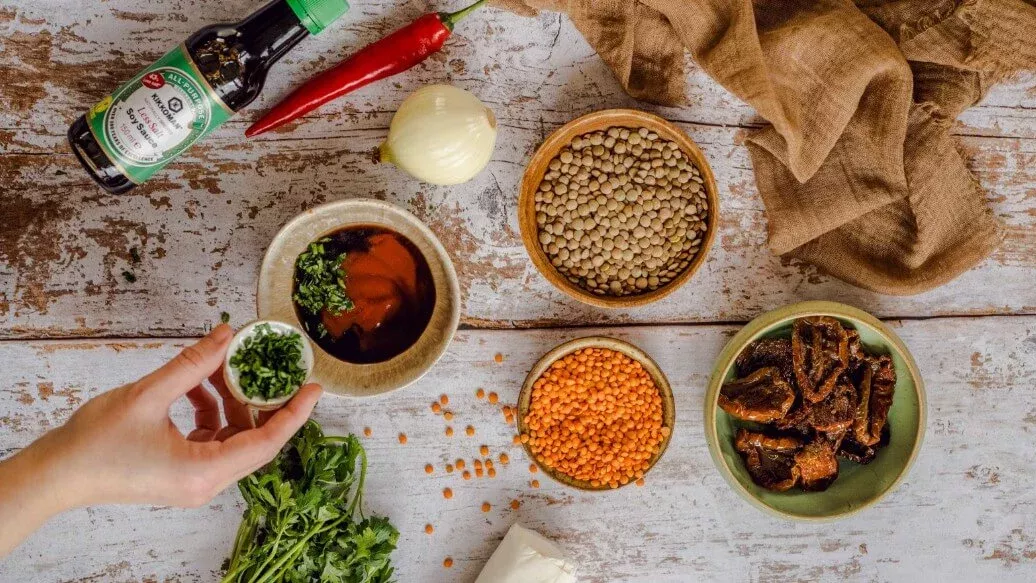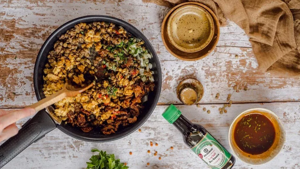 100 g kokte grønne linser – 50 g kokte røde linser – 40 g soltørkede tomater i olje – ½ liten løk – 1 ss rapsolje – 1 ss Kikkoman Naturlig Brygget Soyasaus Med Mindre Salt – ½ ts tørket merian – 1 ss hakket persielle – ½ ss hakket chili – 1 klype grovmalt pepper