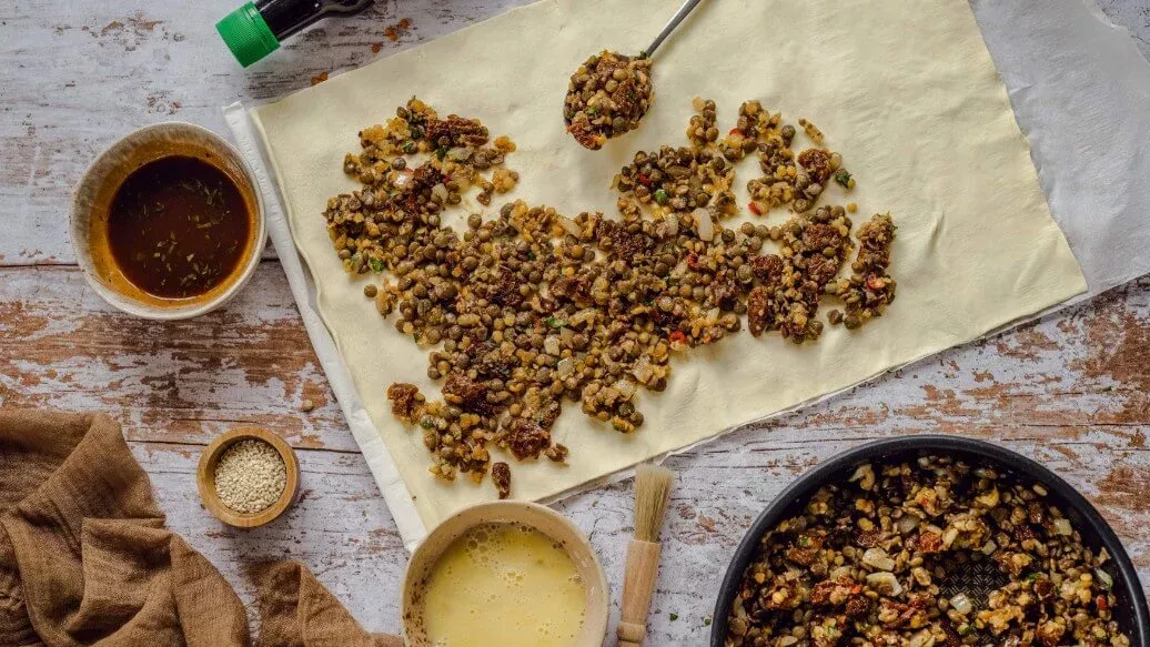 Denne deilige retten kombinerer sprø butterdeig med et aromatisk fyll av grønne og røde linser og soltørkede tomater. Mild, men full av smak, perfekt som snacks eller et lett måltid. Tilsetter du chilipepper, får retten et spicy kick som vil glede alle som elsker sterkt krydret mat.