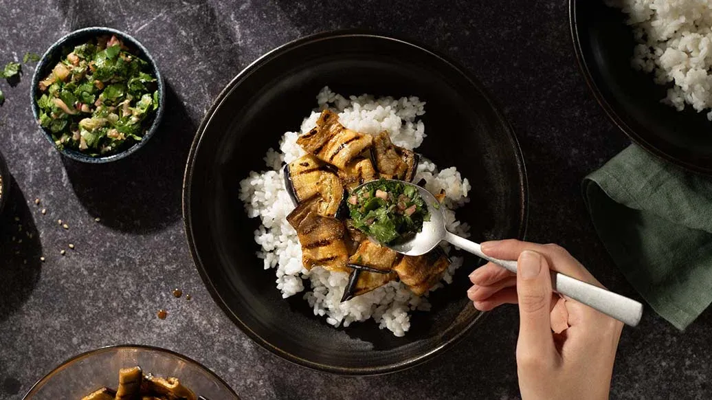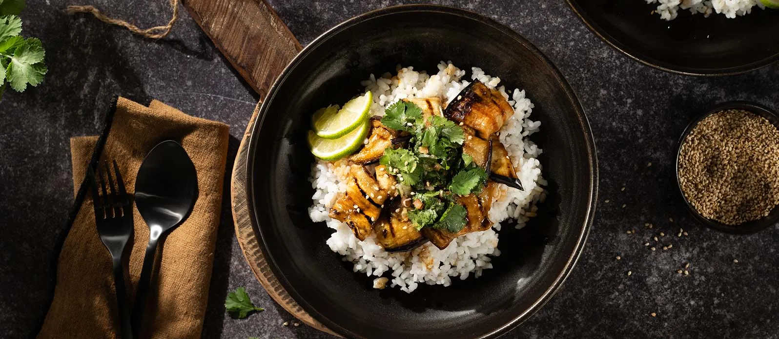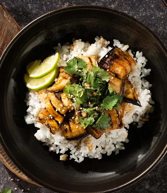 Fordel risen på to boller, som til en chirashi-bolle, og legg aubergineskivene oppå. Dryss over sesamfrøene og server med limesalsaen.