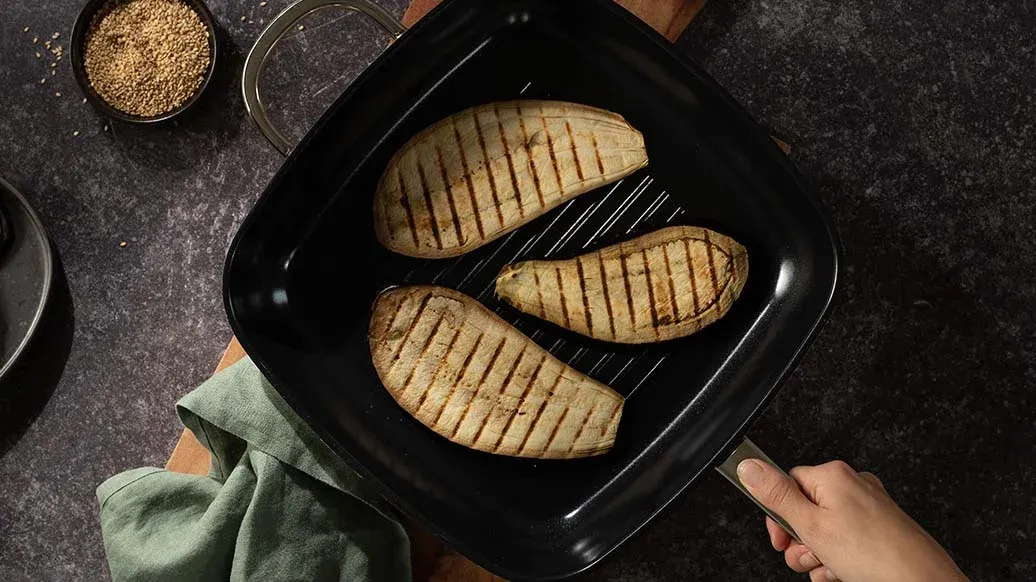 Skjær auberginen på langs i skiver, litt under 1 cm tykke. Stek dem i 8–10 minutter på en lett oljet grill, i en grillpanne eller i en non-stick stekepanne uten olje. Legg gjerne noe lett oppå, for eksempel et pannelokk. Rist sesamfrøene i en liten, tørr panne under hyppig omrøring til de er gylne.