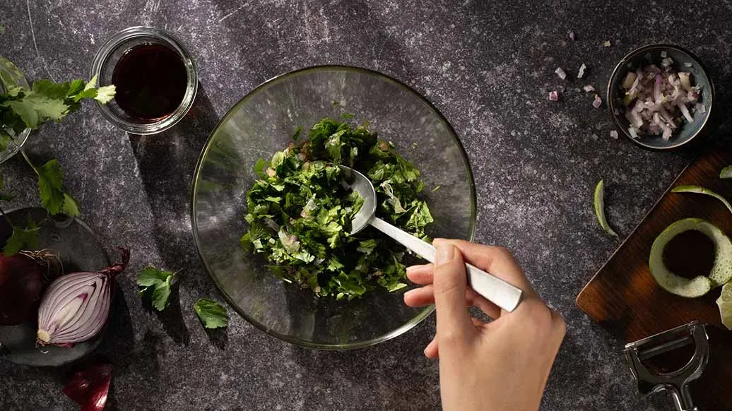 Lag salsaen først: Skrell limen og skjær kjøttet i terninger. Bland med rødløk, koriander og Kikkoman Ponzu Yuzu.