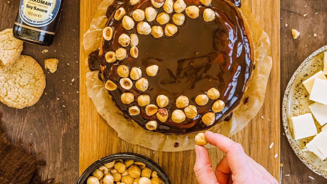 Luftig gresskarostekake laget med kjeksbunn går perfekt sammen med karamell. Det delikate anstrøket av salt fås ved å tilsette en magisk ingrediens, nemlig soyasaus. Knasende hasselnøtter gjør smaken enda mer smaksrik og sørger for en spennende tekstur.