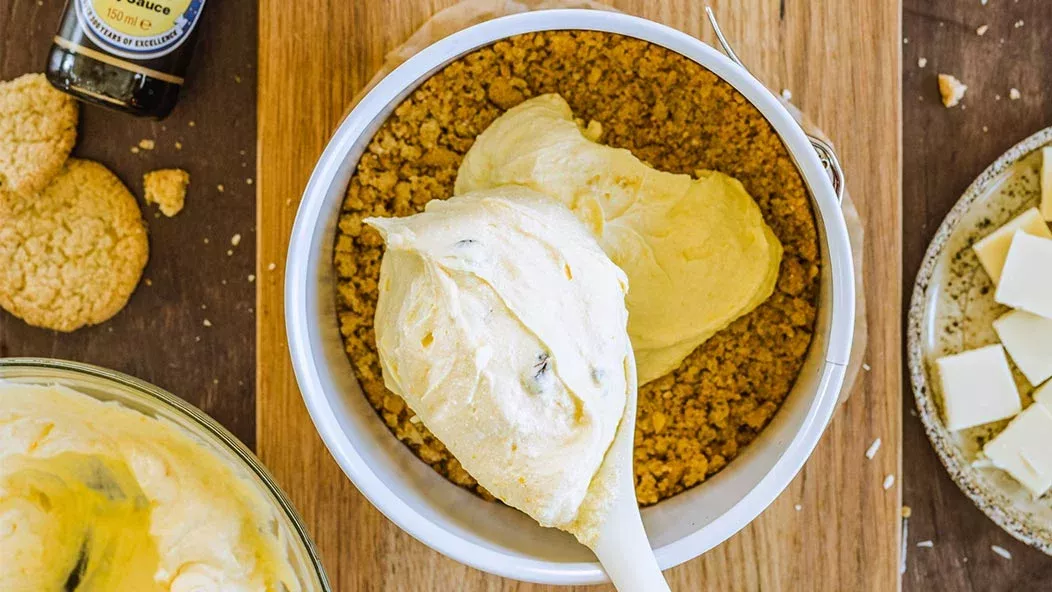 Forvarm stekeovnen til 180 °C. Bland knuste kjeks med smeltet smør og raspet appelsinskall. Trykk blandingen ned i en kakeform oppå bakepapir. Bak i 10 minutter og la stå til avkjøling etterpå.