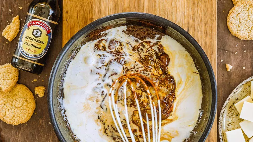 100 g hvitt sukker – 1 ss smør – 200 g kremfløte – 1 ss Kikkoman Naturlig Brygget Soyasaus