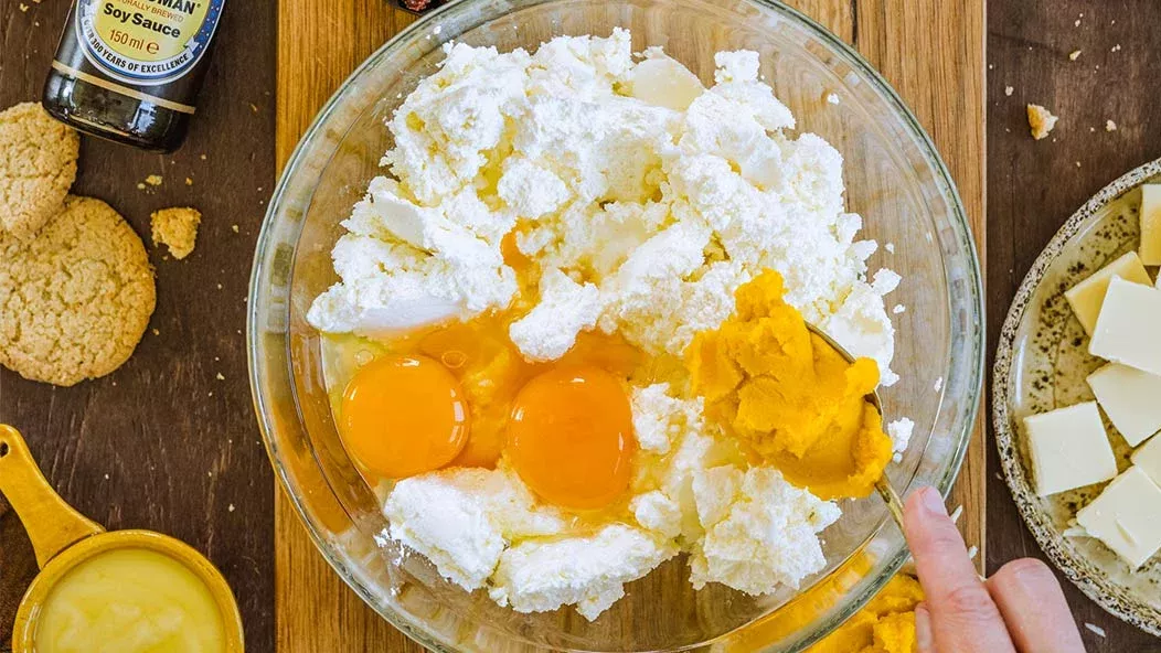 Smelt sjokoladen og smøret sammen i en dobbel kjele eller vannbad. La det stå til avkjøling. Bland cottage cheese med egg og gresskarpuré.