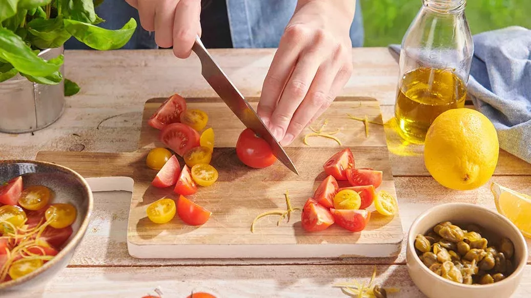 100 g cherrytomater – 50 g kapers – ½ ts raspet sitronskall – 2 ss olivenolje – Noen blader fersk basilikum