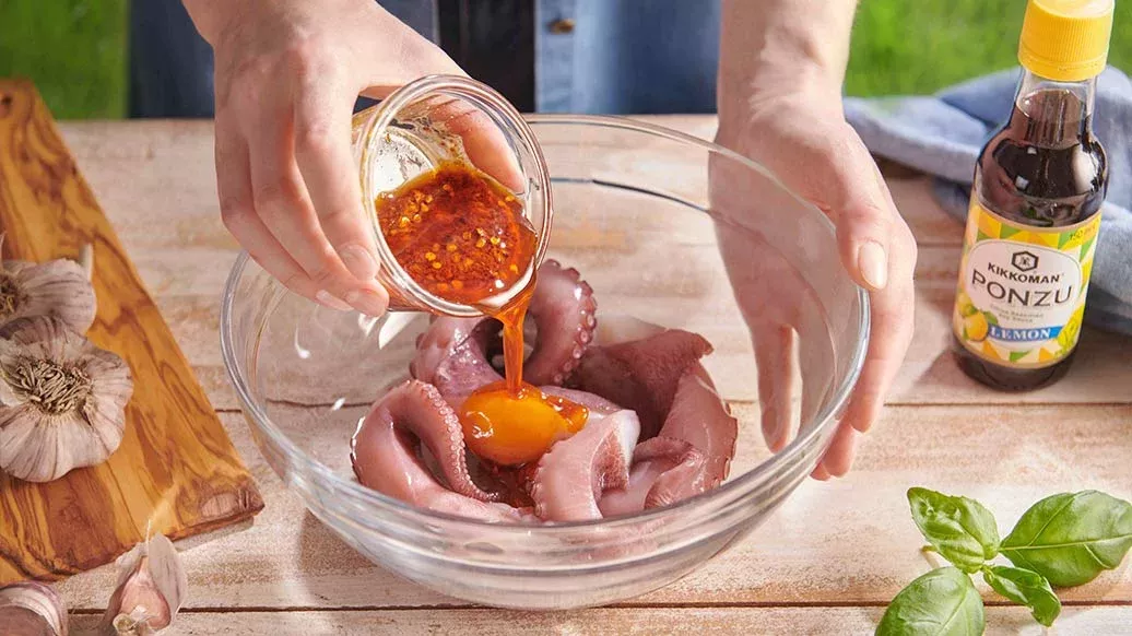 Skjær den blansjerte blekkspruten i mindre stykker. Bland Kikkoman Ponzu Sitron i en bolle med knust hvitløk, paprikapulver, olivenolje og chiliflak. Tilsett blekksprutarmene og la stå til marinering i kjøleskapet i 1 time.