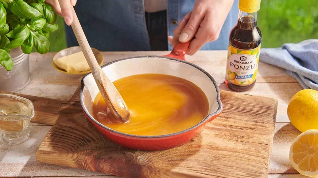 Hell sake, Kikkoman Ponzu Sitron og sitronsaft i en kasserolle og gi et oppkok (ca. 1 min.). Tilsett smør og ta av varmen. Rør om til smøret smelter og en jevn saus dannes.