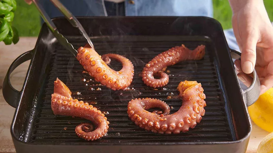 Grill blekkspruten i ca. 3 minutter på hver side. Server med salsa og ponzusmør.