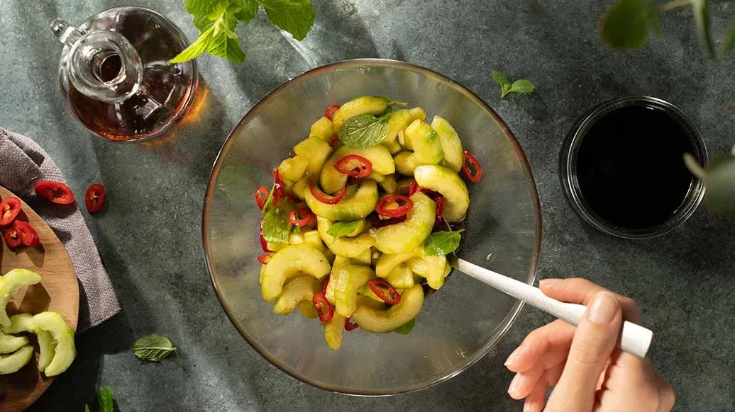 Del agurken i fire på langs og fjern frøene. Skjær hver del i skrå skiver. Mariner i chili, mynte, Kikkoman Kryddersaus for Sushiris, Kikkoman Soyasaus og Kikkoman Sesamolje.