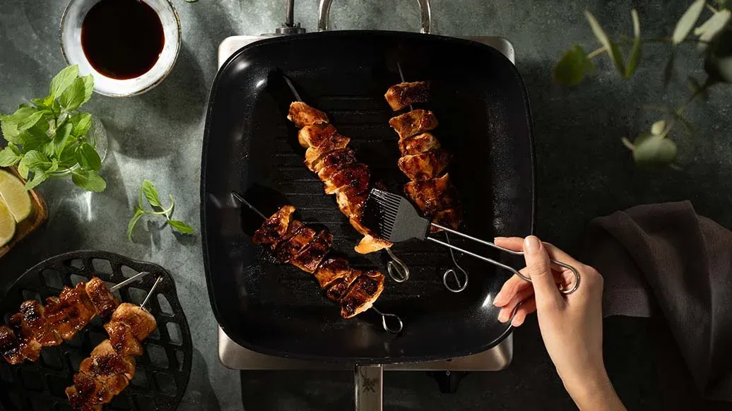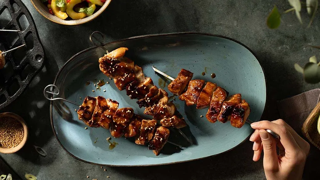 3 ss Kikkoman Teriyaki BBQ-Saus med Honning & Røykaktig Smak – Grillspyd