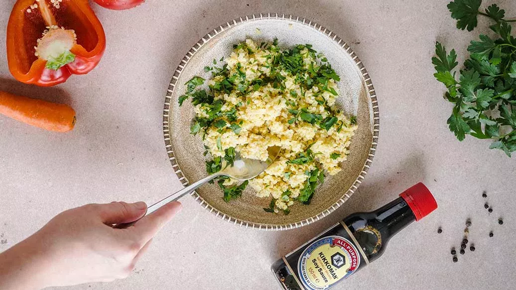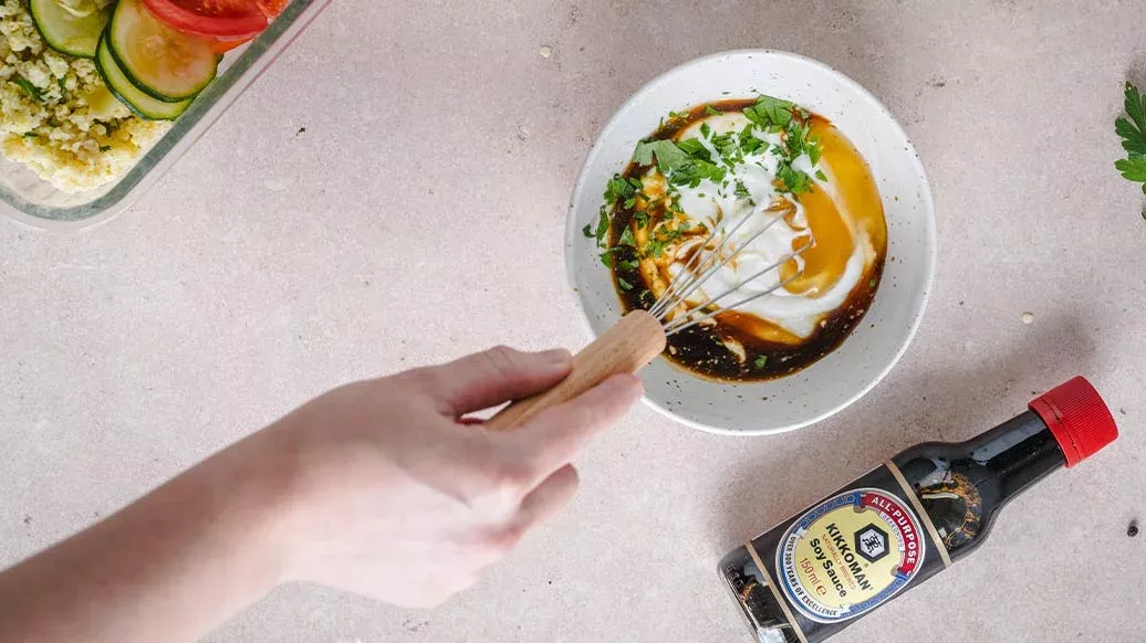 3 ss yoghurt naturell – 2 ss Kikkoman Naturlig Brygget Soyasaus – 1 ss limesaft – 1 ss honning – 1 ss hakket persille