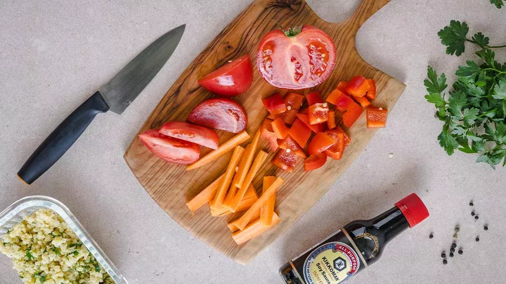 Skjær gulroten i staver, del tomatene i fire, og skjær paprikaen i terninger. Legg alle ingrediensene i en lunsjboks.