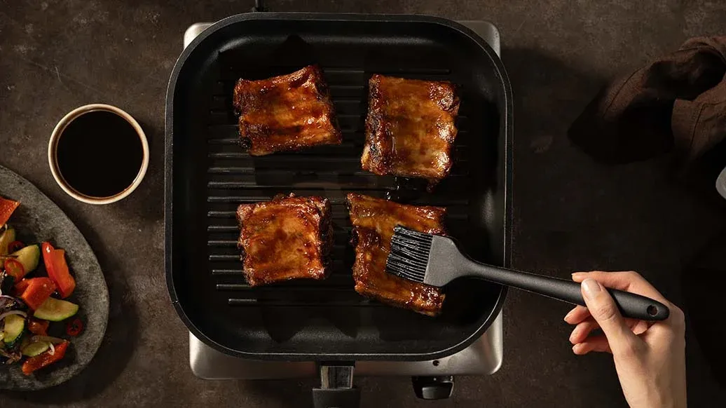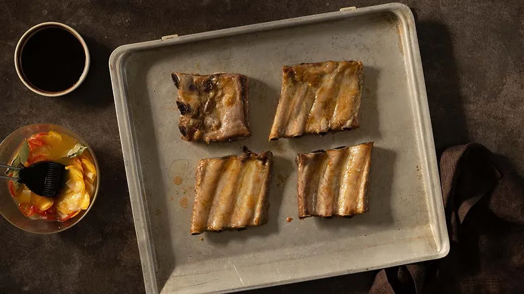 Du kan også steke spareribsene i ovnen til de er blitt fine og møre, la dem avkjøles og ta dem med deg på grillfesten. Da trenger du bare å gi dem en rask runde på grillen og glasere dem – det tar bare et par minutter mer enn om du griller dem rett fra ovnen.