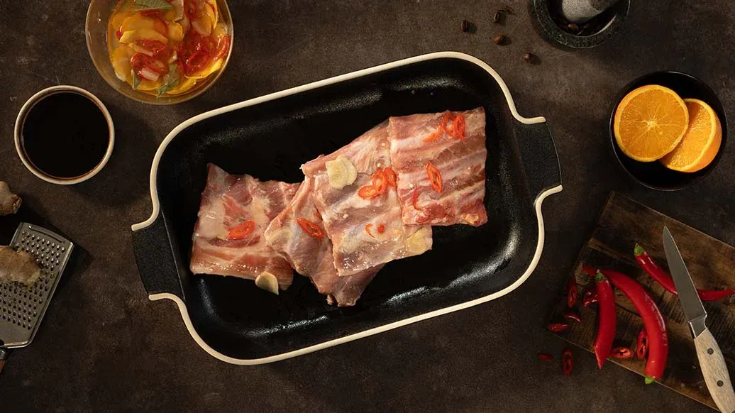 Legg spareribsene i marinaden i en passende beholder, legg på lokk og la stå til marinering i 1 til 2 dager. Vend spareribsene iblant.