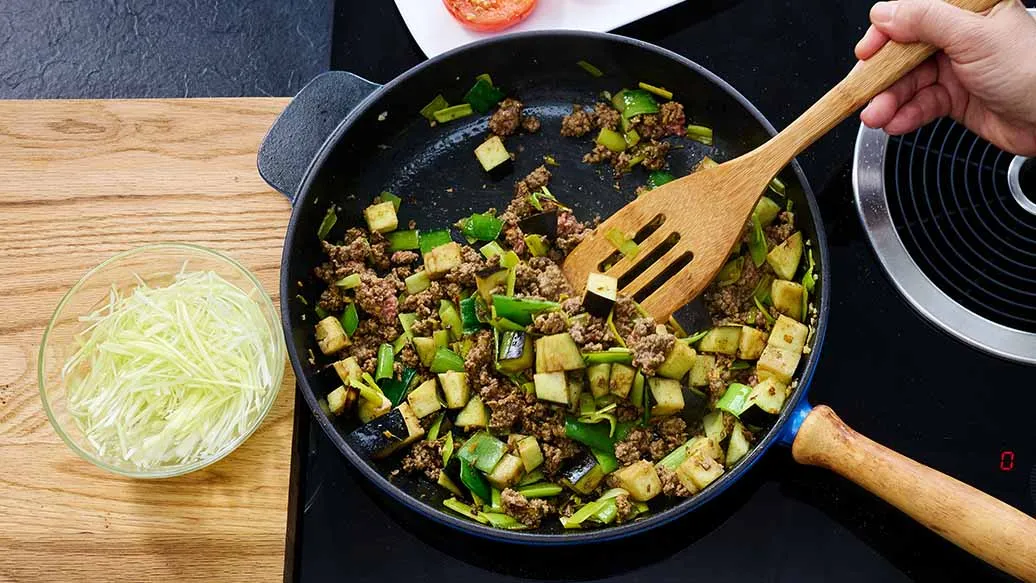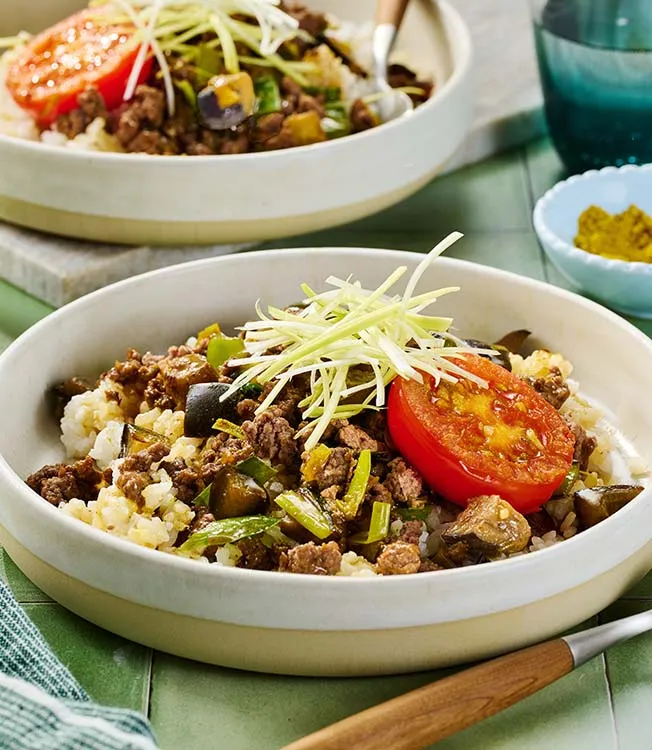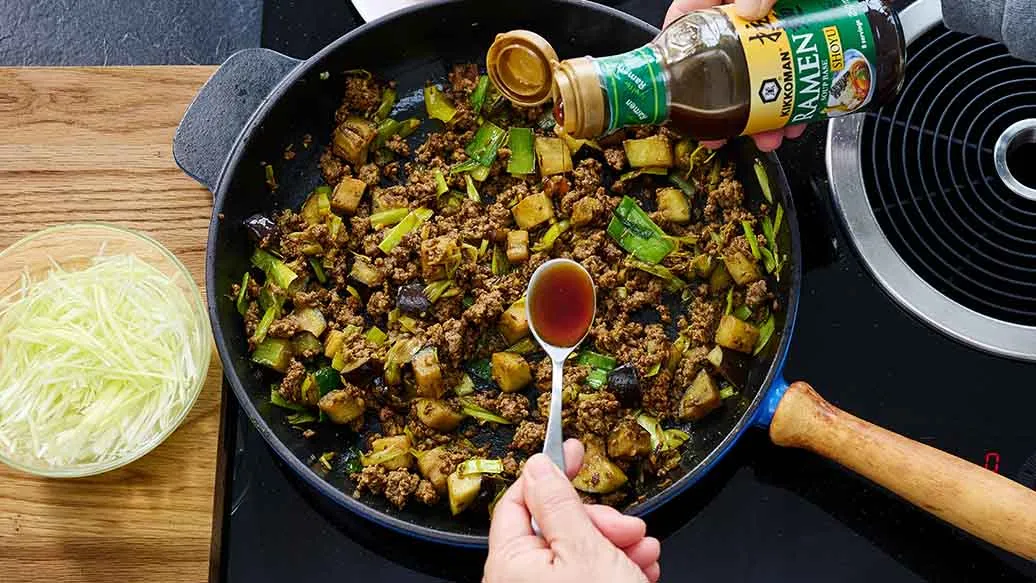 Denne japanske curryretten bruker purreløk istedenfor løk for et lettere måltid som likevel har svært fyldig smak. Aubergine absorberer den rike umamien fra kjøttdeig, Kikkoman Soyasaus og Kikkoman Ramen Suppebase. Fersk tomat og rå purreløk tilfører krønsj og balanse.