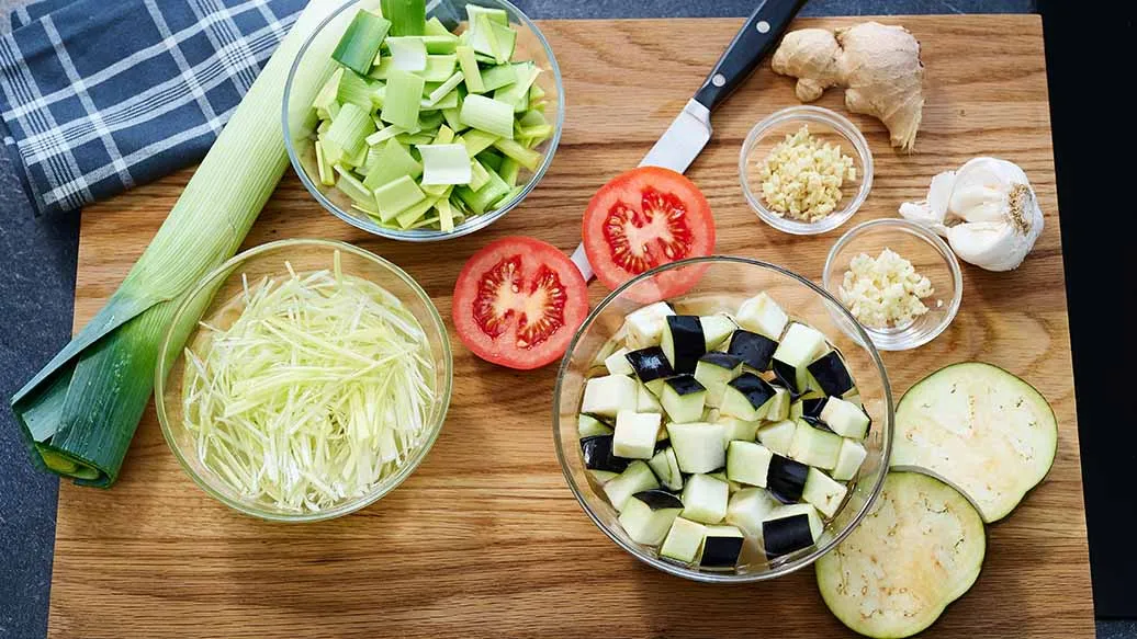 Finhakk hvitløk og ingefær. Skjær 5 cm av den hvite delen av purreløken, og finsnitt den på langs for å lage topping. Skjær resten av purreløken i små biter. Skjær auberginen i 1 cm store terninger og legg dem i saltet vann (5 dl vann med 1 ts salt) i ca. 10 minutter, og sil deretter av. Del tomaten i to horisontalt.