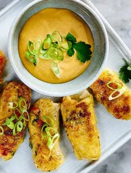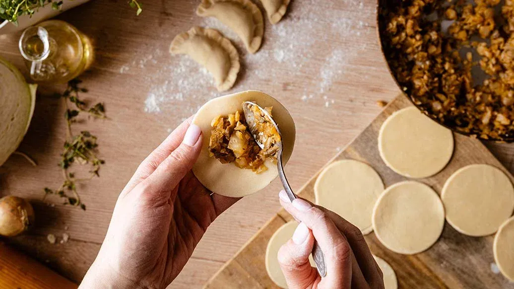 Riv kålen i små biter. Legg bitene i en gryte, dekk med kokende vann og kok i 15–20 minutter til de er møre. Sil av og press ut overflødig vann. La kålen avkjøle seg litt, finhakk den deretter. Skjær løken i fine terninger, og finhakk hvitløk og champignon. Varm opp oljen i en panne, tilsett løken og sauter til den blir glassaktig. Tilsett hvitløken og stek i ytterligere ett minutt. Tilsett champignon og deretter kål. Krydre med pepper, Kikkoman Kimchi Chilisaus og Kikkoman Soyasaus. Sauter alt sammen i 2–3 minutter. Sett deretter fyllet til side for avkjøling.