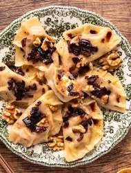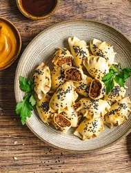 Del deigen i tre porsjoner. Ta en porsjon og kjevl den ut til et tynt ark. Pass på at de to andre porsjonene er tildekket, så de ikke tørker ut. Stikk ut sirkler av deigen. Legg en teskje fyll midt på hver sirkel, brett i halvmåneform og trykk kantene sammen for å lukke dem. Legg dumplingsene på et melstrødd brett og dekk dem med en håndkle. Gjør det samme med de to andre porsjonene. Deigmengden skal tilsvare ca. 15–20 dumplings. Kok dumplingsene i omganger i kokende saltet vann.